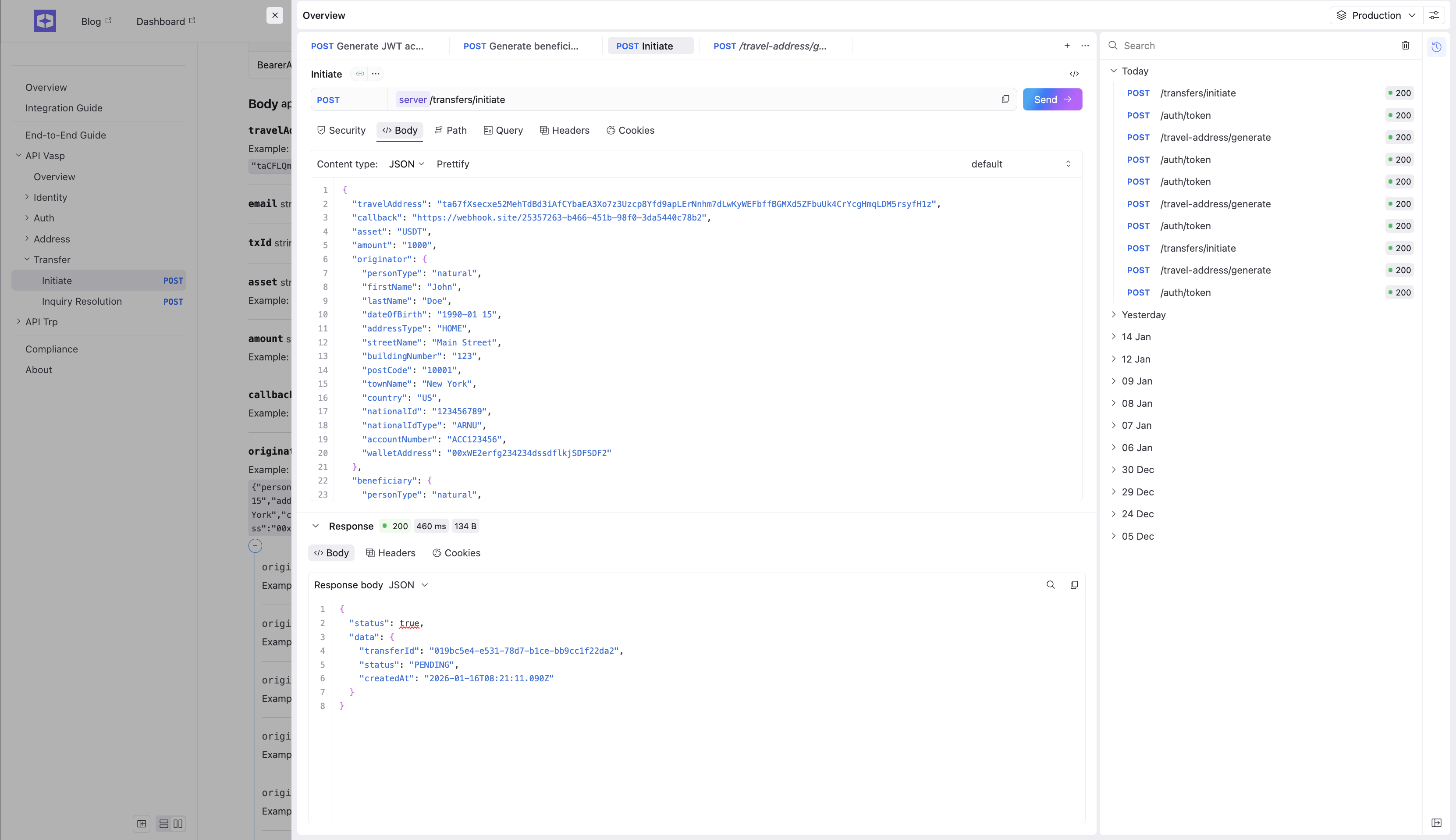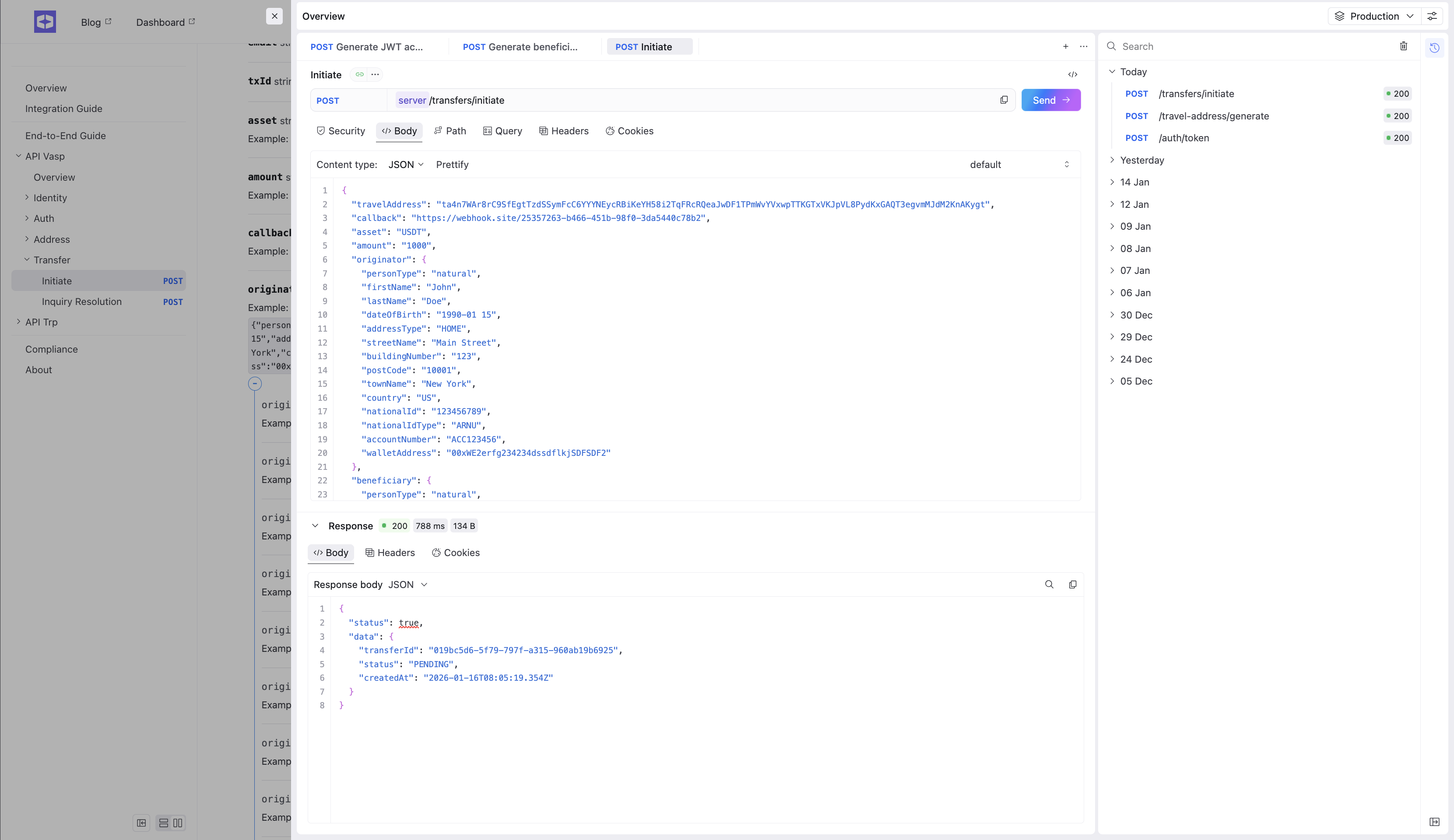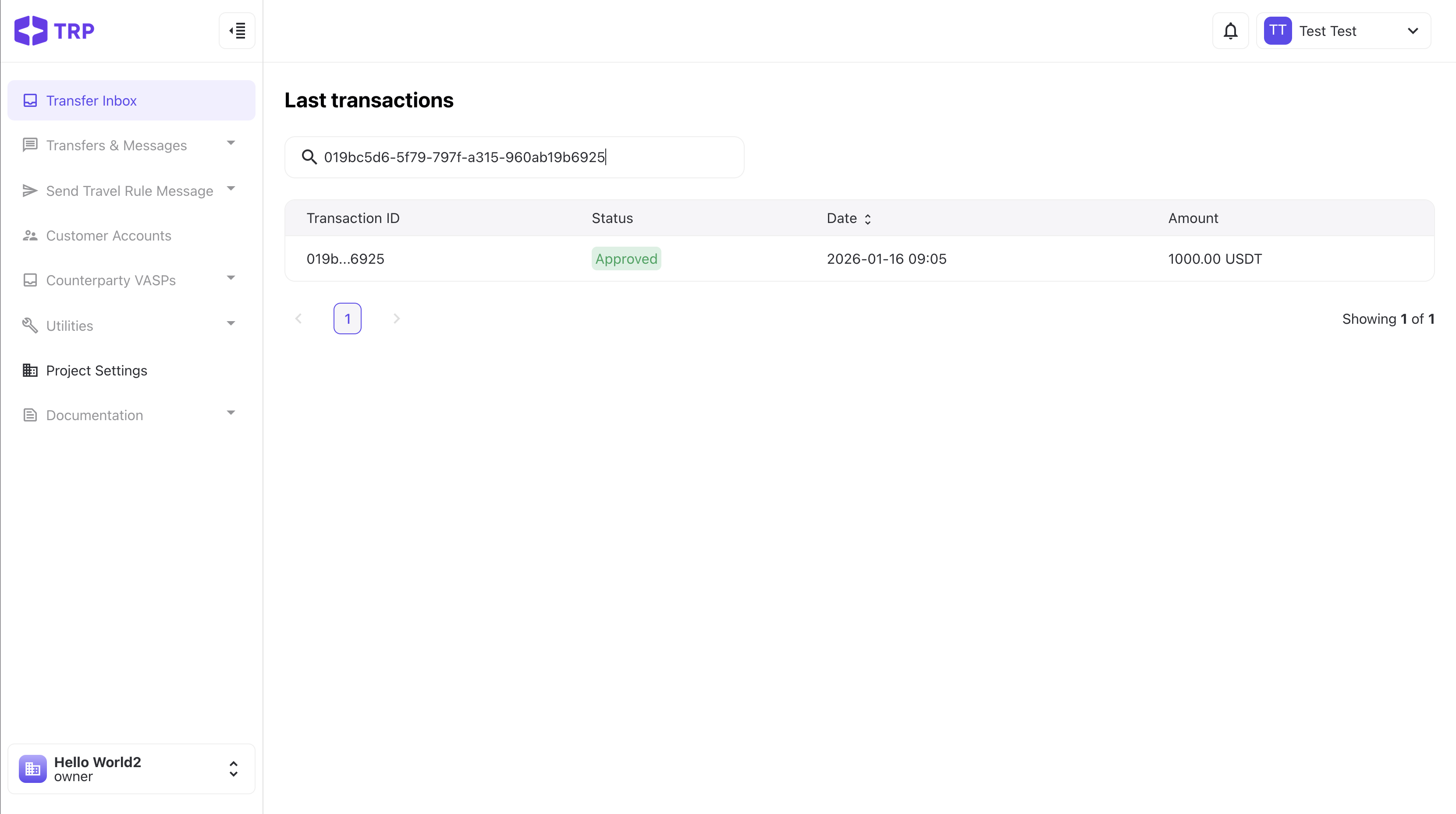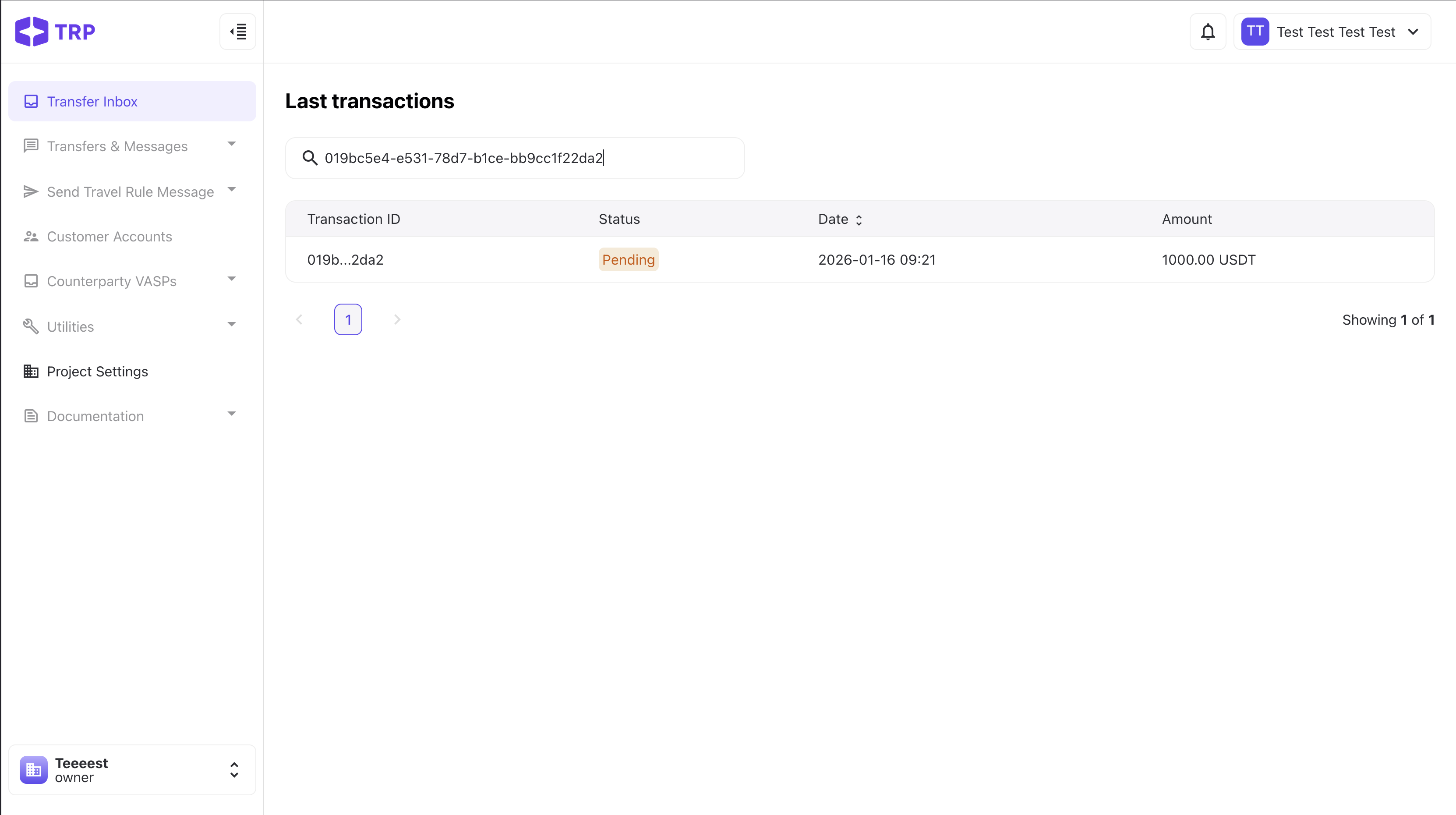 This flow demonstrates how a single VASP user can authenticate, generate a Travel Address, create a transfer, and then locate it in the Transfer Inbox.