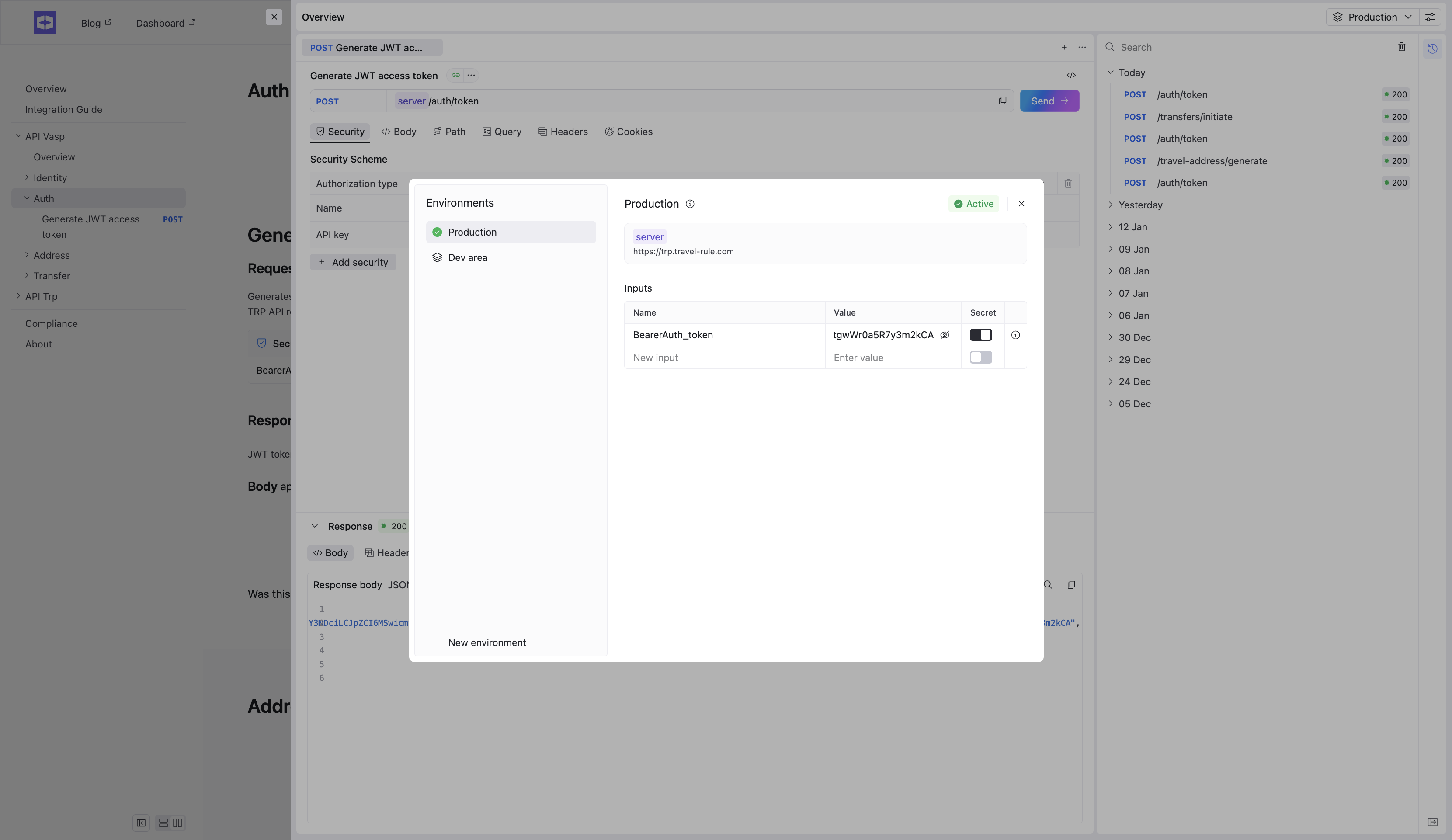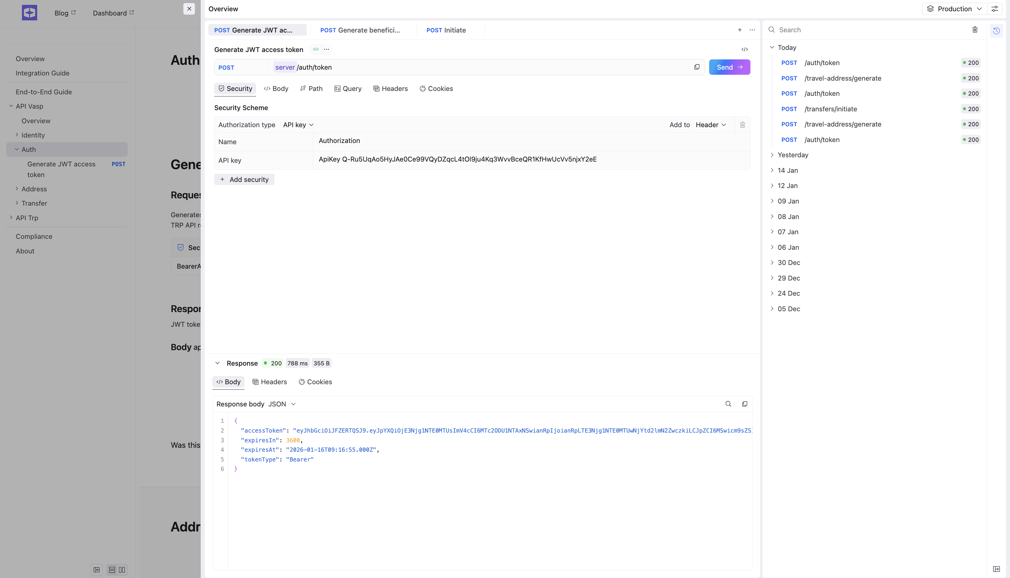 Copy the received access token and add it to the authorization settings of your API requests (for example, as a Bearer token in request headers).
