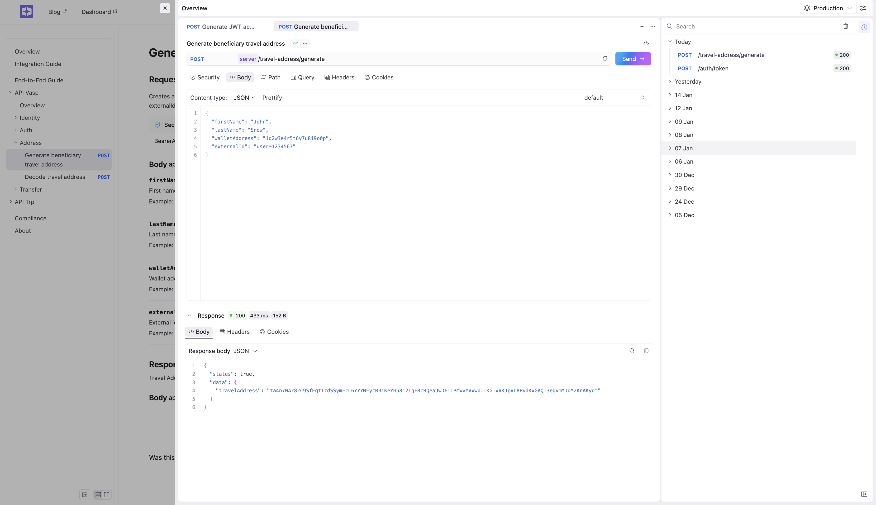 This flow demonstrates how one user generates a Travel Address and another user initiates a transfer using that address. The transaction will be visible to both users.
